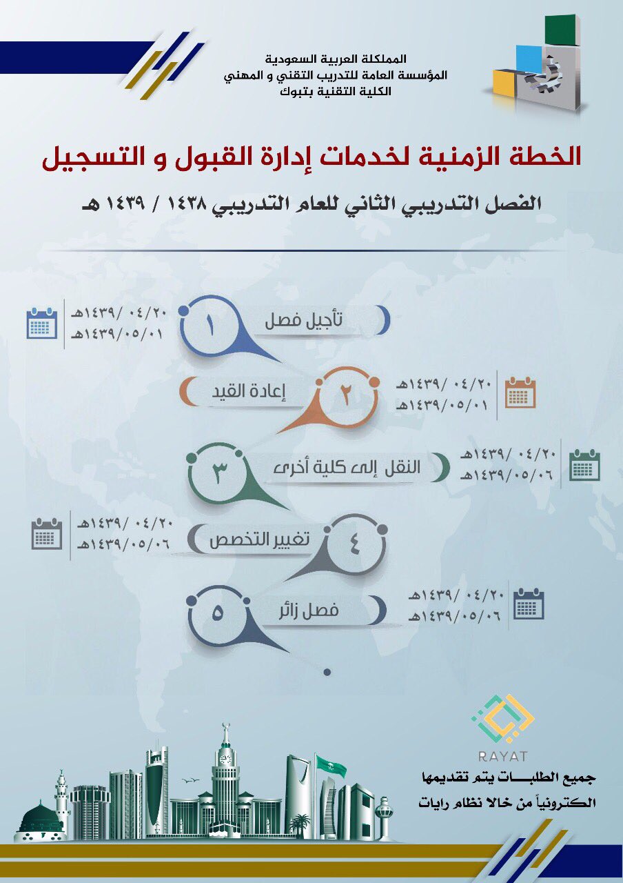 كثرت التساؤلات حول التسجيل في الكلية التقنية للبنات بتبوك وذلك بالتزامن مع بداية الفصل الصيفي في نظام رايات 1441 في المملكة العربية السعودية حيث ستكون الدراسة بشكل نظري فقط وتعتمد على نموذج التدريب عن بعد بسبب. أعلنت الكلية التقنية بتبوك عن فتح باب القبول والتسجيل إلكترونيا بدء ا من الغد وحتى 12 3 1439هـ لمرحلة البكالوريوس صباحي مسائي للفصل التدريبي الثاني من العام التدريبي 1438 1439هـ. فتح باب التسجيل في تقنية تبوك.